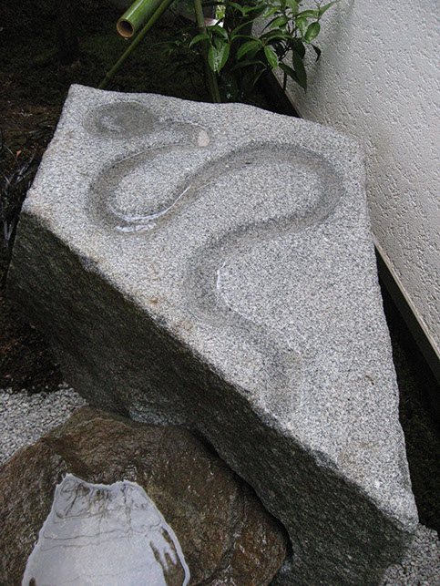 Kan was blessed to be able to incorporate some polished granite sculptures created by Kyoto artisan Katsuaki Takahashi. In honour of this collaboration with such a prolific sculptor, Kan created his own unique piece, hand-carving a “river” upon a stone surface.