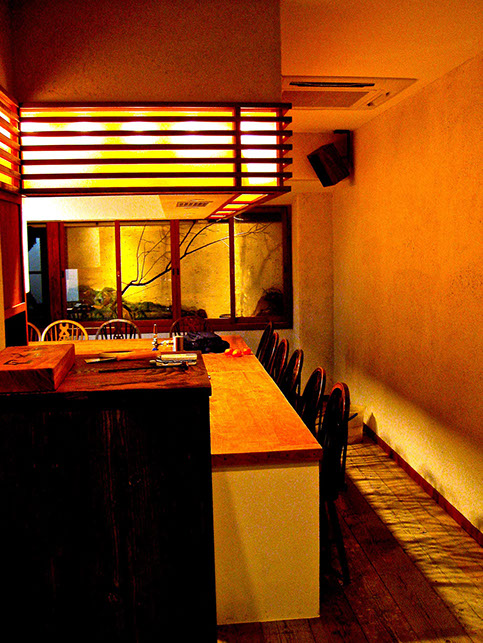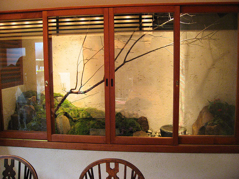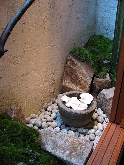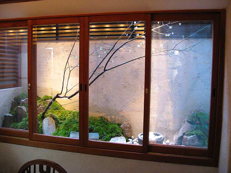 The concept for this small space in an inner-city restaurant was to offer viewers a window through to another world, as in the great masterpieces of the ages, which have been painted on fusuma (sliding doors) and byobu (folding screens). The solution to the small space was to install large glass panels with simple frames, and build up the interior using rockwork and moss. The stone water feature provides an offering space, and the plum blossom tree appears as if painted with calligraphic strokes.