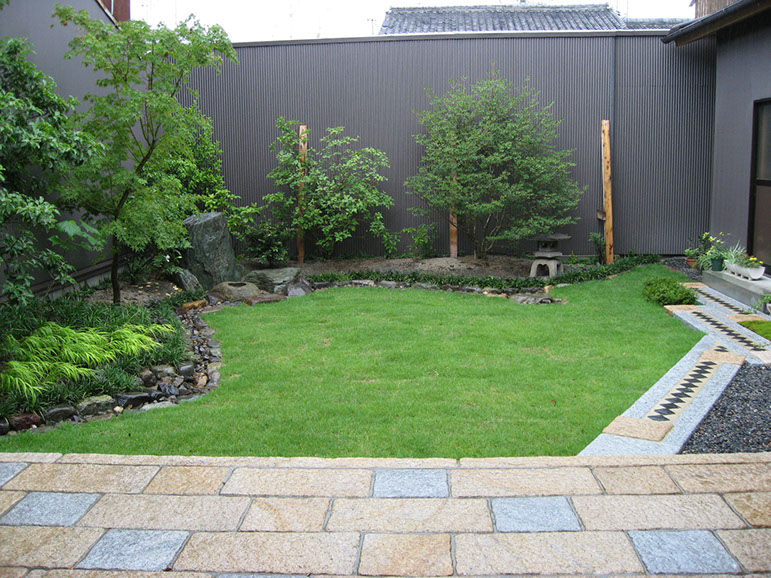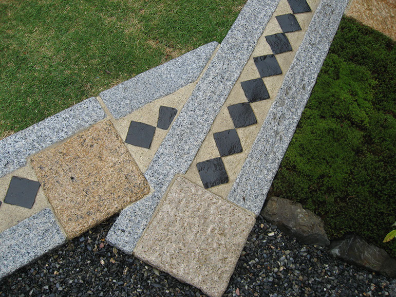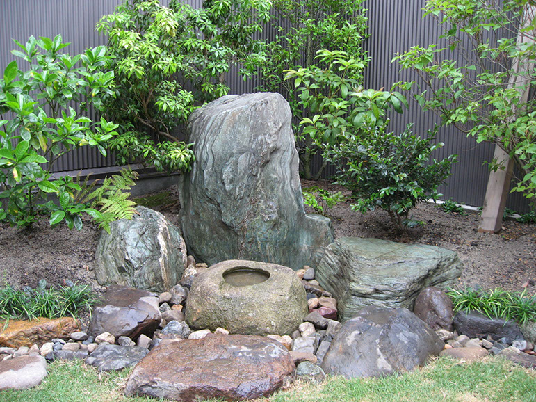 Paving, pathways, natural irrigation channels and new plantings all serve to feature the Yoshino River rocks and the stone bowl that functions as a receptacle for water purification.